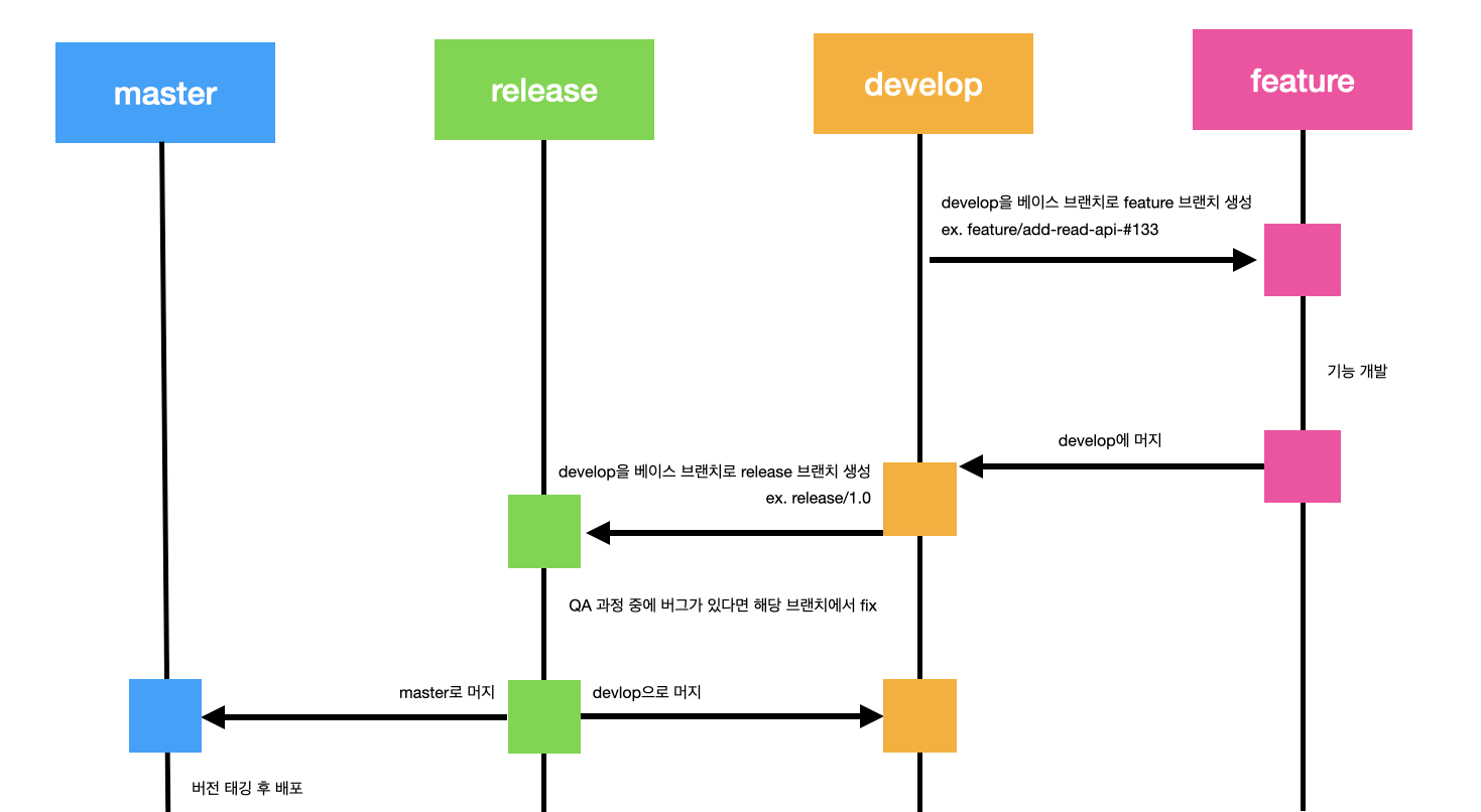 develop에서 feature 브랜치를 생성하고, 기능 개발이 끝나면 develop에 머지합니다. 그 이후에 develop을 베이스 브랜치로 release 브랜치를 생성하게 되는데요. 만약 QA 과정 중에 버그가 발생한다면 release 브랜치에서 fix한 후 커밋합니다. 그 이후 QA가 종료되면 release를 master, develop으로 각각 머지합니다. 그 이후에 master에서 버전을 태깅하고 배포합니다.