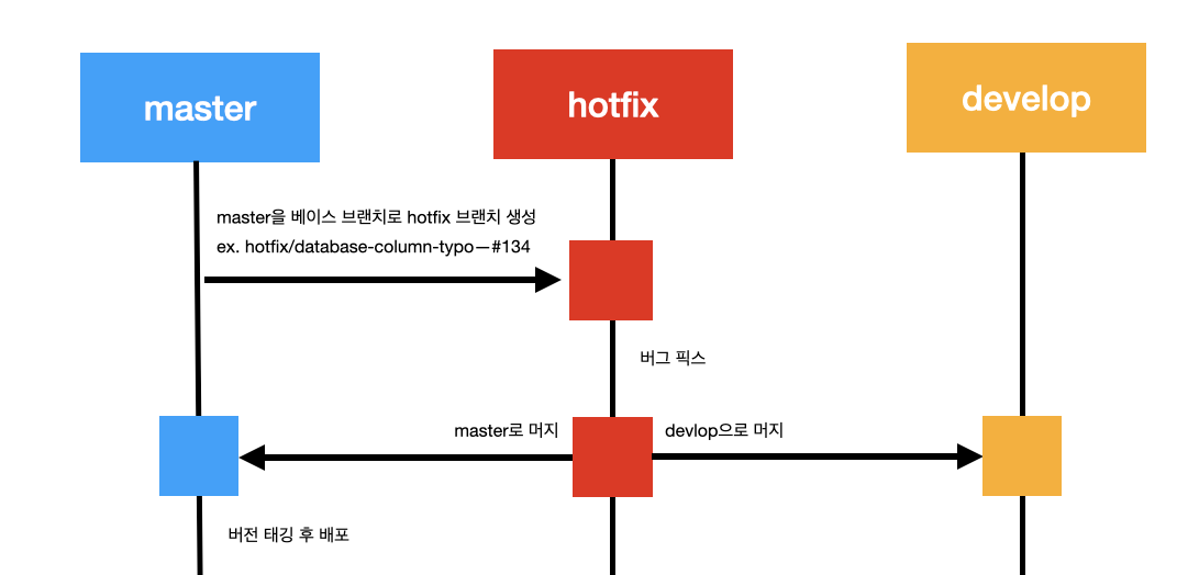 master에서 hotfix 브랜치를 생성하고, 해당 브랜치에서 버그를 픽스한 후에 master, develop으로 각각 머지합니다. 그 이후에 master에서 버전을 태깅하고 배포합니다.