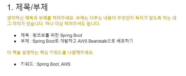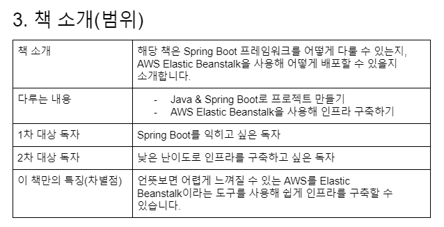 처음에 제가 생각했던 제목은 <왕초보를 위한 스프링부트> 였습니다. 지금 제목인 <스프링 부트 3 백엔드 개발자 되기> 와는 다르지만, 컨셉이나 내용은 동일합니다. 사진에서는 제목, 책 소개만 첨부했지만 이외에도 몇 가지 정보를 더 담아 작성했습니다.