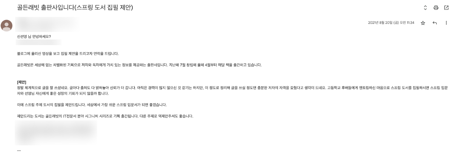 집필 제안을 받은 것은 2021년 8월이었습니다. 감사하게도 출판사에서 제 블로그를 인상 깊게 보시고 메일로 집필 제안을 주셨고, 제안을 받은 당시에는 무엇을 했는지 기억이 나지 않지만 이것저것 많이 하던 시기라서 제가 책을 집필하기 위해 가용할 수 있는 리소스가 부족할 것 같은 상황이라 꽤 많이 고민을 했습니다.