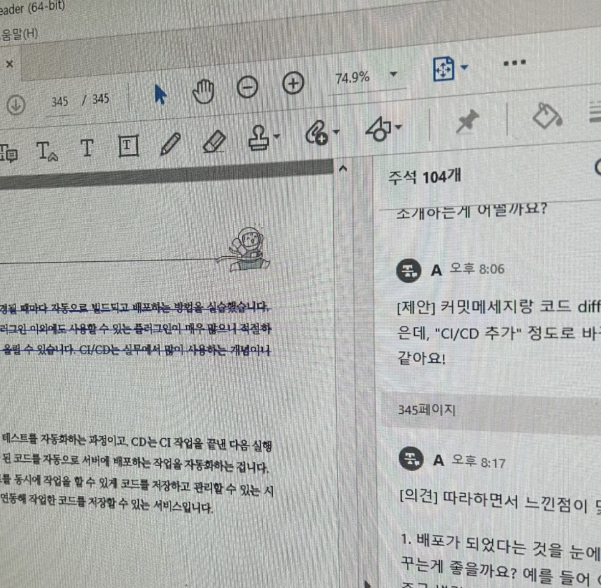 조판본이 나올 때까지 정말 여러 번 봤다고 생각했는데, 새로운 형태로 결과물이 나오니 다시 수정할 부분이 자꾸만 눈에 보이고 여러 번 수정을 거쳤습니다. 특히 첫 조판본을 볼 때는 코드를 따라 치며 1페이지부터 끝까지 봤는데요. 이미 여러 번의 수정을 거쳤음에도 불구하고 주석을 104개나 달기도 했습니다. (물론 2차, 3차, 4차 조판까지도 주석은 계속 추가되었습니다 … ㅎㅎ)