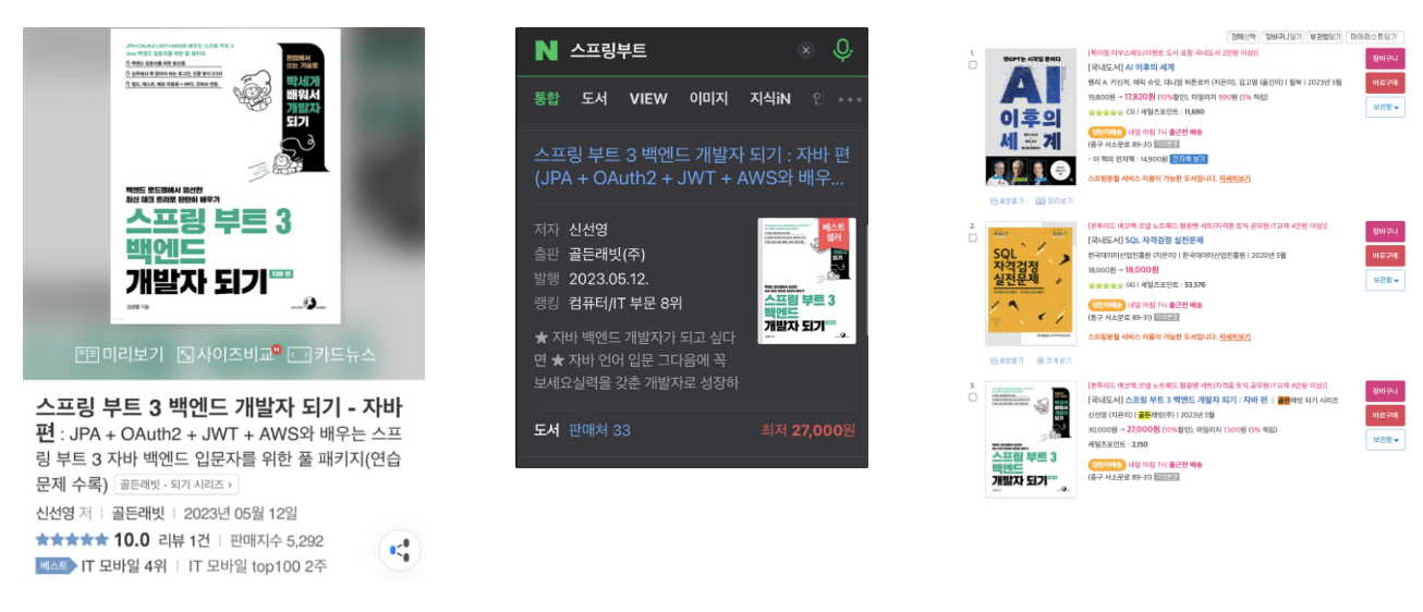 3 버전을 쓰는 것은 출판사의 입장에서 굉장한 셀링포인트이기 때문에 놓치기 싫었을 것이었고, 저는 독자가 실망하는 상황이 만들어지지 않길 바랐습니다. 그렇다고 스프링부트3을 제대로 사용해보지 않고 아는척 글을 쓰기도 싫었습니다. 그래서 이 고민을 담당자님께 전달했고, 여러 사람의 논의를 거쳐 제 책은 제목이 바뀌게 되었습니다.