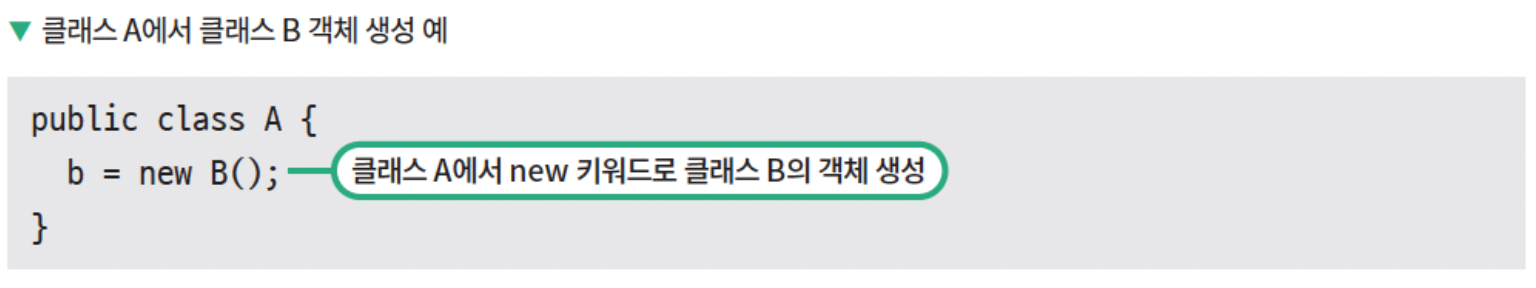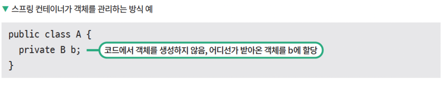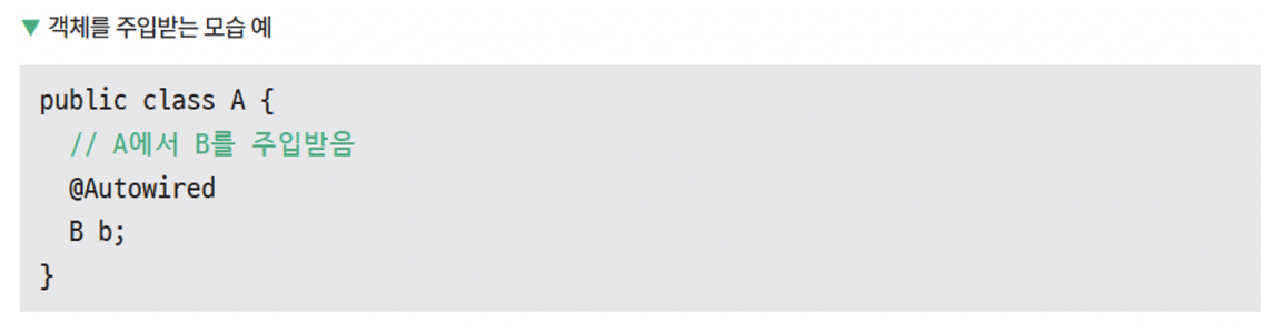 여기에서 사용하는 @Autowired라는 애너테이션은 스프링 컨테이너에 있는 빈이라는 것을 주입하는 역할을 하는데요. 빈은 쉽게 말해 스프링 컨테이너에서 관리하는 객체를 말합니다. 빈은 바로 다음에 설명할 개념이므로 우선은 이 정도만 이해하고 넘어가도 됩니다. 이전 코드에서는 개발자가 직접 B 객체를 생성했지만 다음 코드는 어딘가에서 B b;라고 선언했을 뿐 직접 객체를 생성하지는 않고 있습니다. 다시 말해 객체를 주입받고 있습니다.