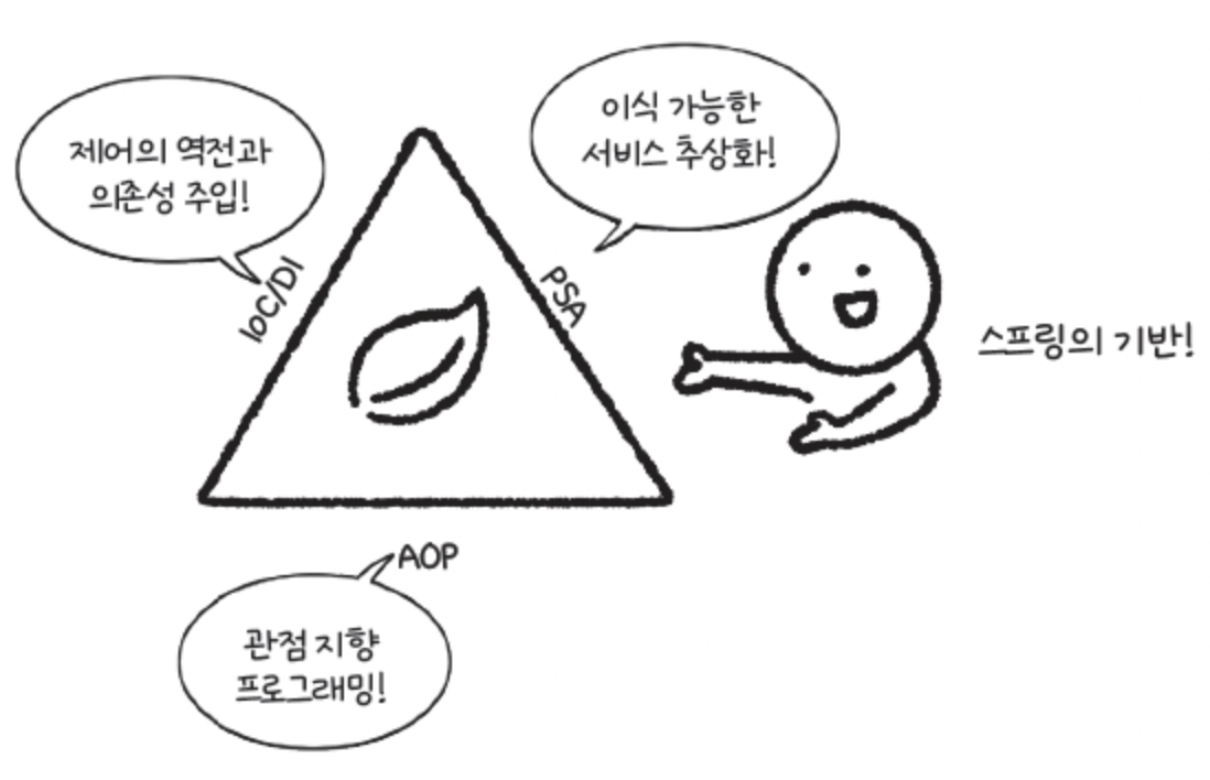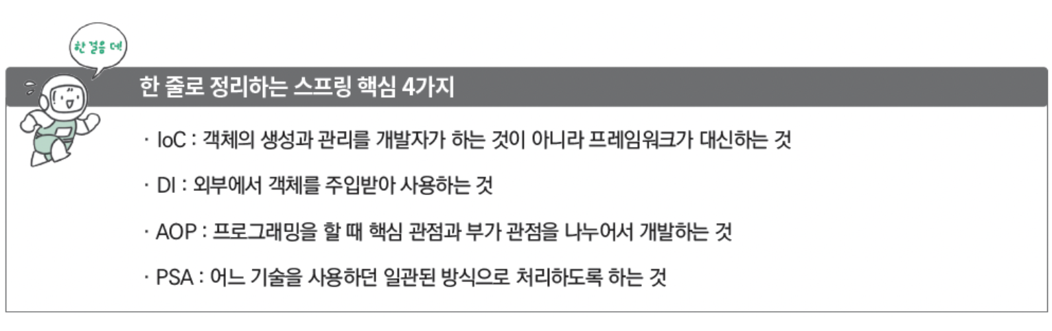 지금까지 스프링의 콘셉트인 IoC, DI, AOP, PSA에 알아보았습니다. 이 기술들을 기반으로 스프링이 만들어졌습니다. 스프링 프레임워크는 IoC/DI를 통해 객체 간의 의존 관계를 설정하고, AOP를 통해 핵심 관점과 부가 로직을 분리해 개발하며, PSA를 통해 추상화된 다양한 서비스들을 일관된 방식으로 사용하도록 합니다.