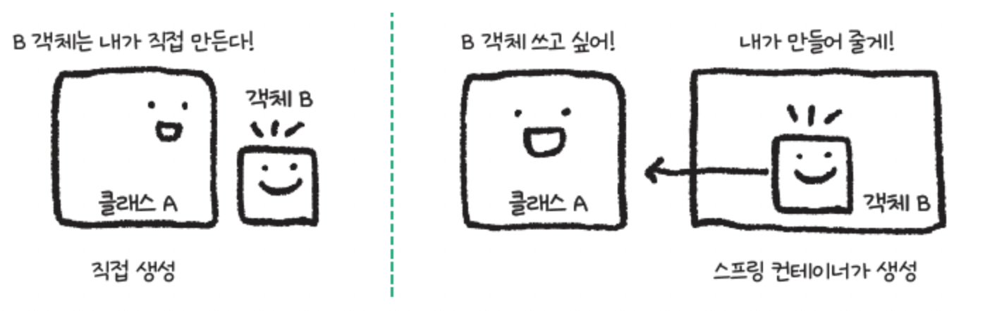 이렇게 코드를 작성해도 프로그램은 잘 동작합니다. 그 이유는 스프링 컨테이너라는 곳에서 객체를 주입했기 때문입니다. 쉽게 말해 스프링 컨테이너가 B 객체를 만들어서 클래스 A에 준 겁니다.